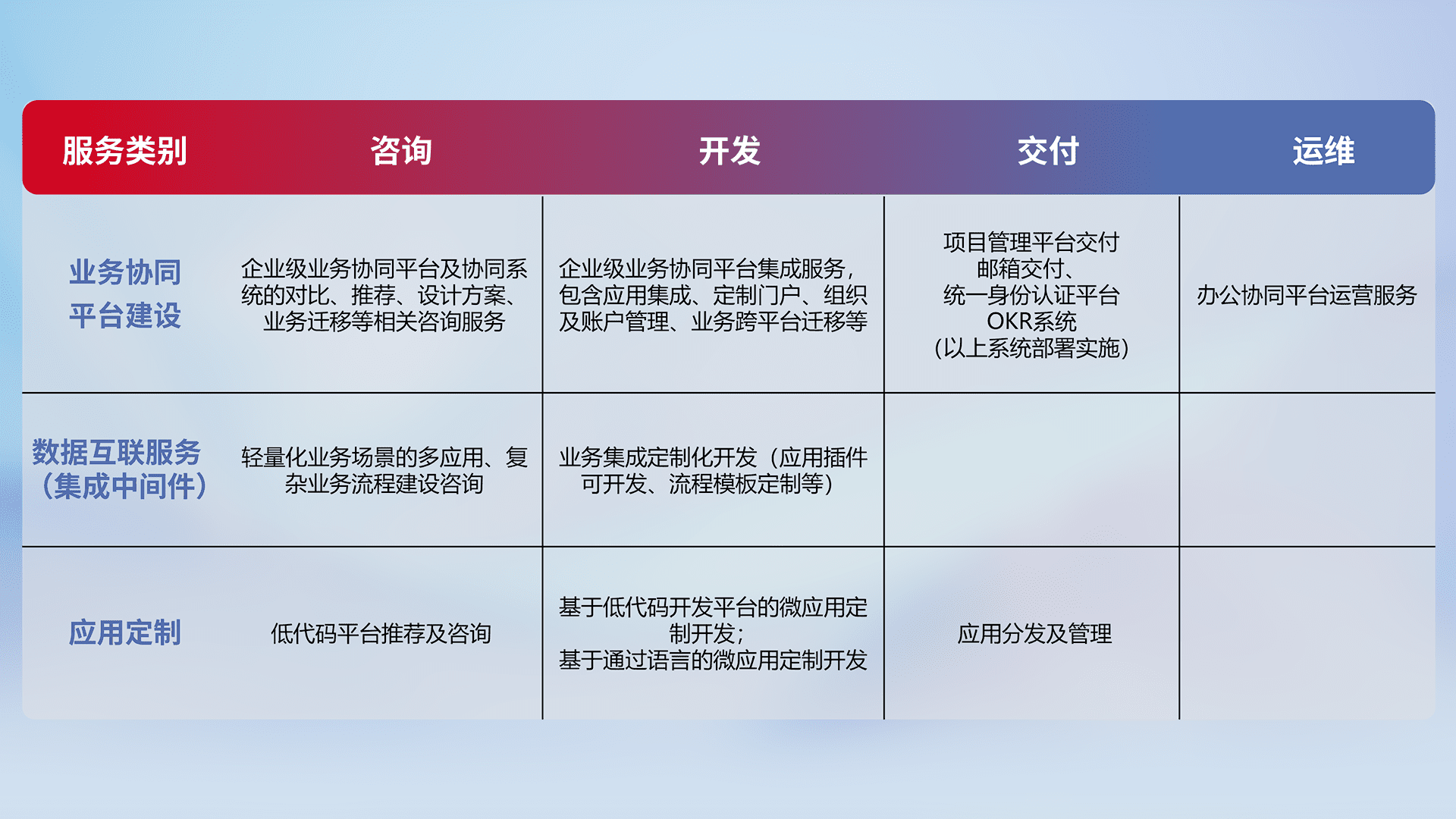 针对钉钉、、、、企微、、、IDaas等平台级产品提供产品的规划、、、方案、、交付、、、定制化开发等服务,,实现如统一协同办公、、、、智能客户服务、、、混合会议管理、、、、智能数据查询、、等业务场景,,,实现数字化转型。。。。